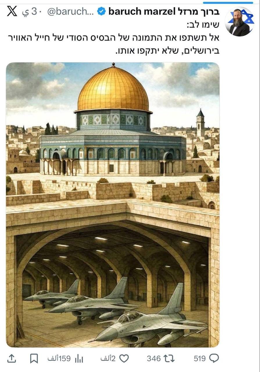 نشر المتطرف الإسرائيلي باروخ مارزل صورة مولدة بالذكاء الاصطناعي تُظهر بشكل مضلل وجود معسكر عسكري أسفل قبة الصخرة والمس...